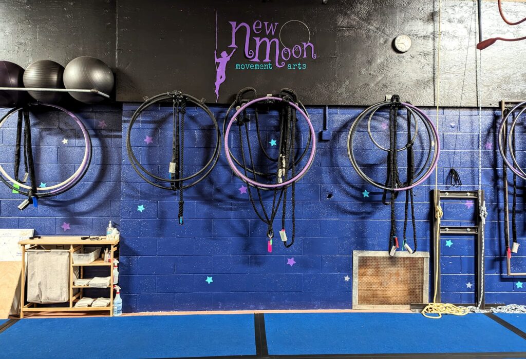New Moon Movement Arts’ youth program serves youth aged 11-17 years. In our youth program, students are introduced to aerial silks, trapeze, rope, lyra (hoop trapeze), and sling in Youth Intro to Aerial. After graduating from intro level, students can begin to specialize in one or several apparatuses.